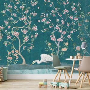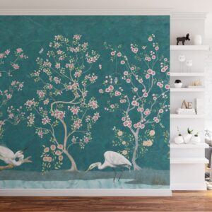 Teal Wallpaper: Crane & Heron Floral Chinoiserie Mural