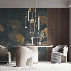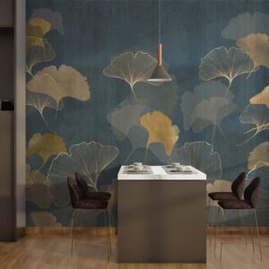 Blue Background Gold Tropical Leaves
