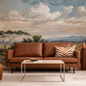 The African Horizon Landscape Wall Mural invites you into a peaceful world of sweeping plains, gentle hills, and winding waterways