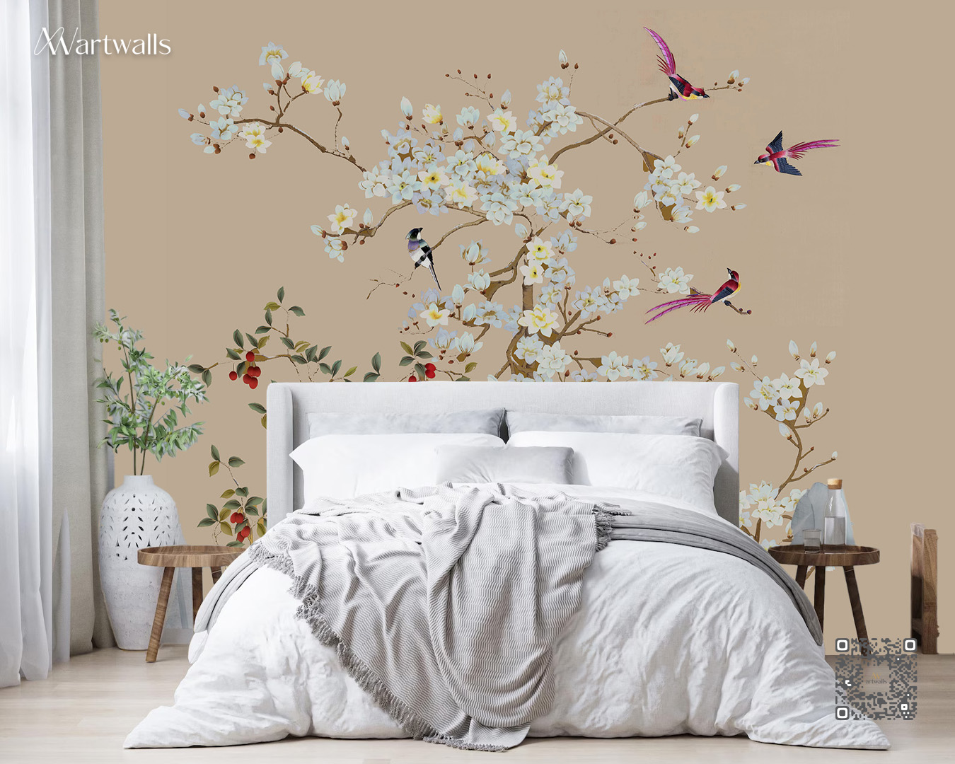 Transform your wall into a refined artwork with this elegant mural inspired by classic Asian botanical art. Delicate blooming branches, colorful birds, and natural fruit elements come together to create a serene, luxurious atmosphere.