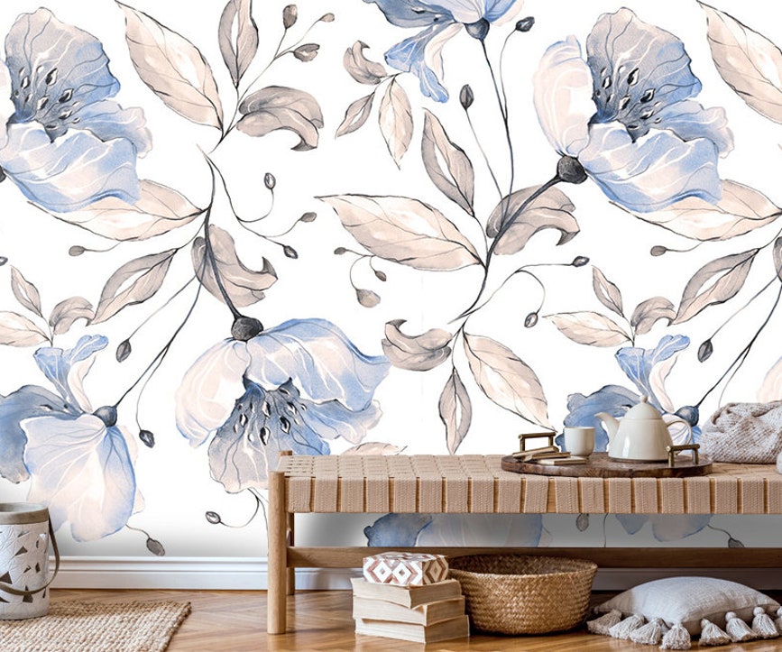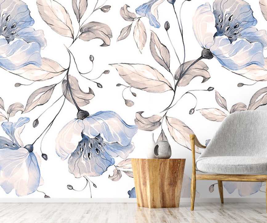Blue Floral Wallpaper Mural Spring Flower Wall Art