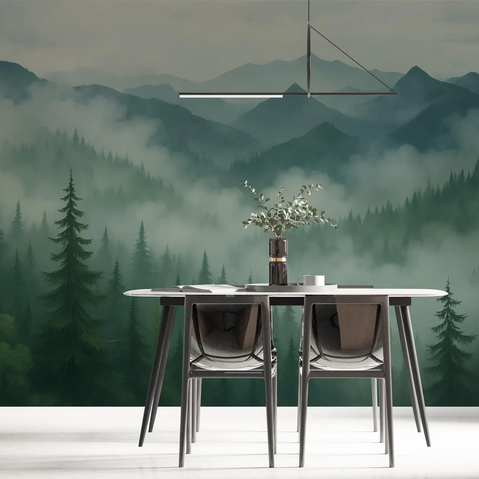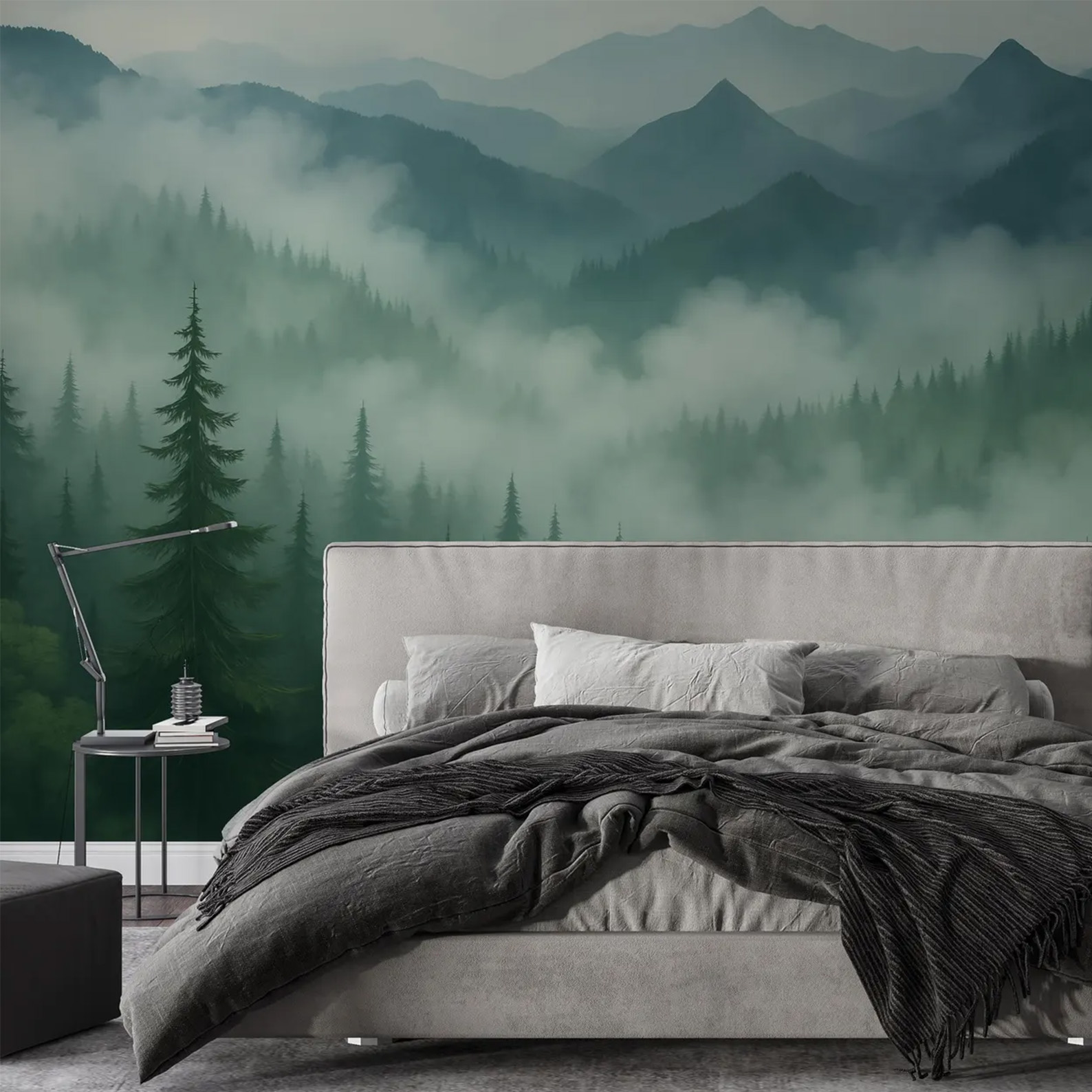 Blue Mountain Landscape Wall Mural, Woodland Wallpaper Peel and Stick, Foggy Forest Wall Paper Bedroom, Nature, Tree Accent Wall Realistic