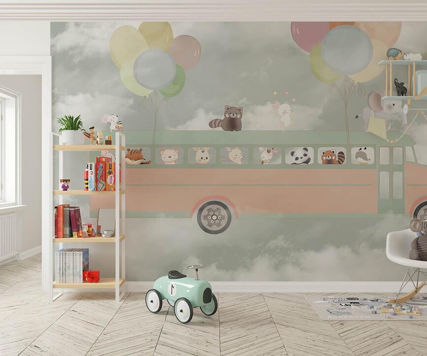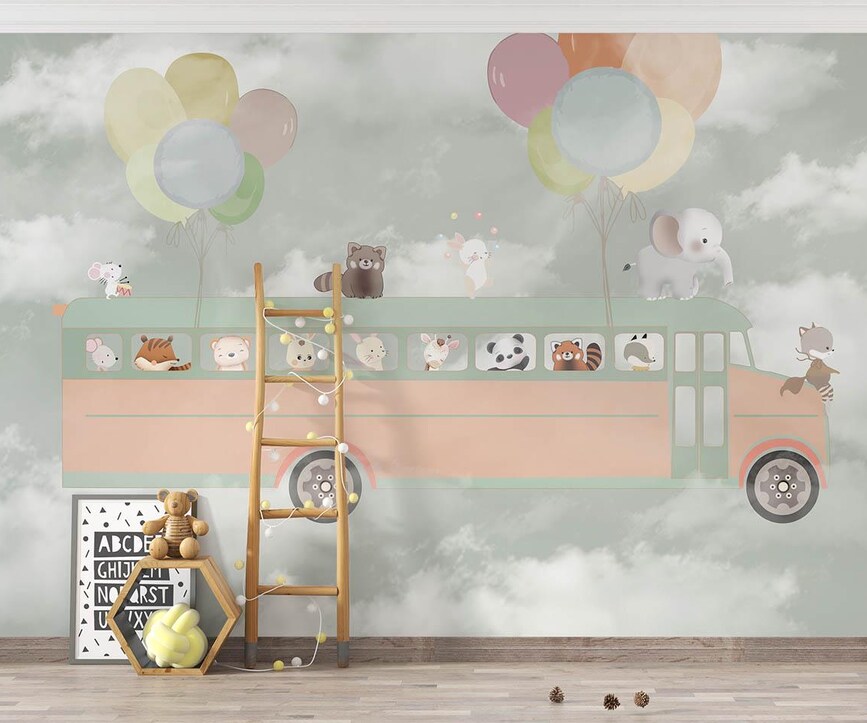 Cute Animals Bus Wallpaper Kids room wallpaper Child room mural