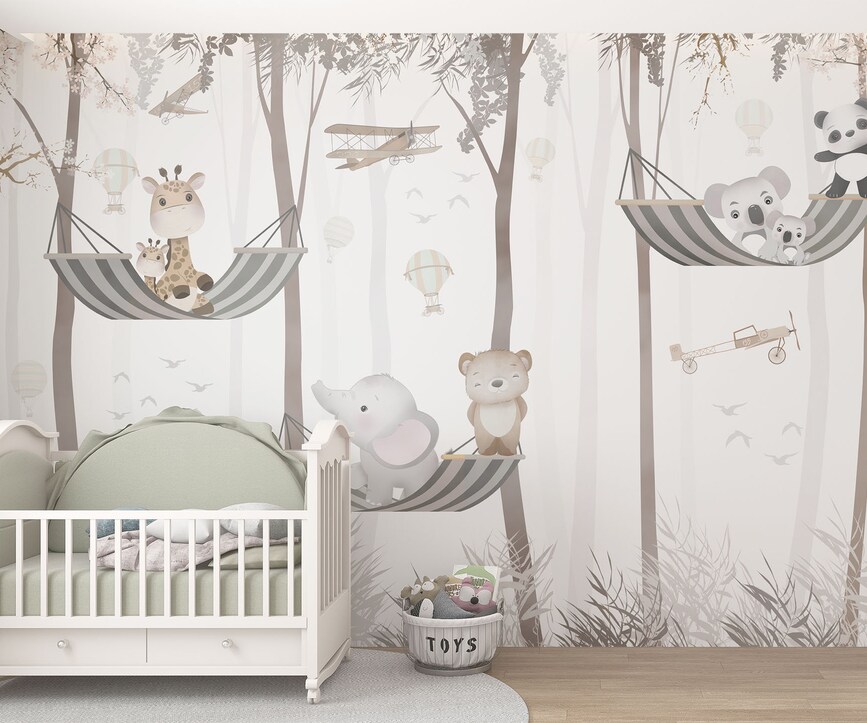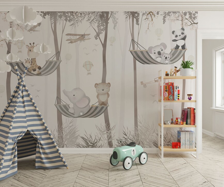 Cute animals on hammock children’s room wall design
