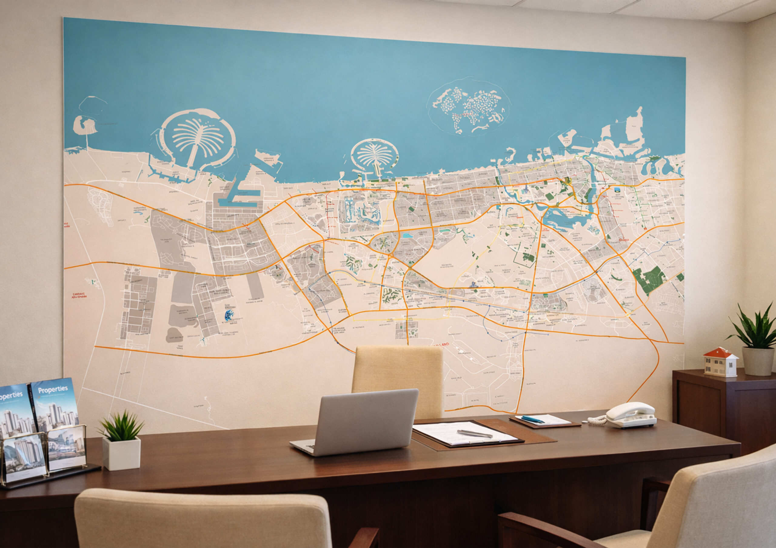 This detailed Dubai map provides a clear and accurate overview of the city’s road network, residential and commercial districts, coastal developments, and major landmarks. Designed in high resolution, it is perfect for large-scale printing and professional use in offices, real estate agencies, logistics companies, and delivery services.