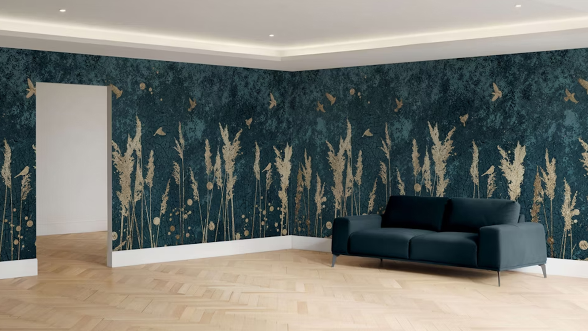 Enhance your home with a touch of contemporary elegance through our Wheat Field Wallpaper Mural. This mural showcases a unique abstract design featuring silhouettes of wheat fields against a dark blue grunge background, complemented by a luxurious gold finish. The intricate and nuanced details of the wheat fields impart sophistication and texture, resulting in a captivating and distinctive feature wall that elevates any room. Ideal for those seeking to infuse modern luxury into their space, our Wheat Field Wallpaper Mural is the perfect choice for transforming your walls.