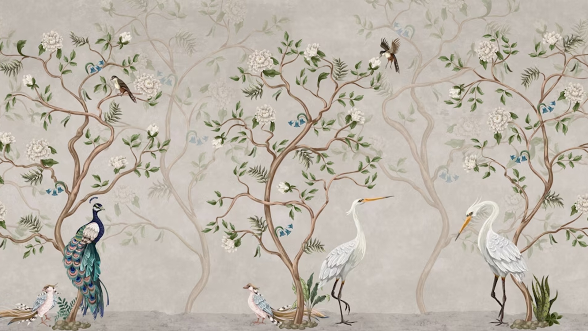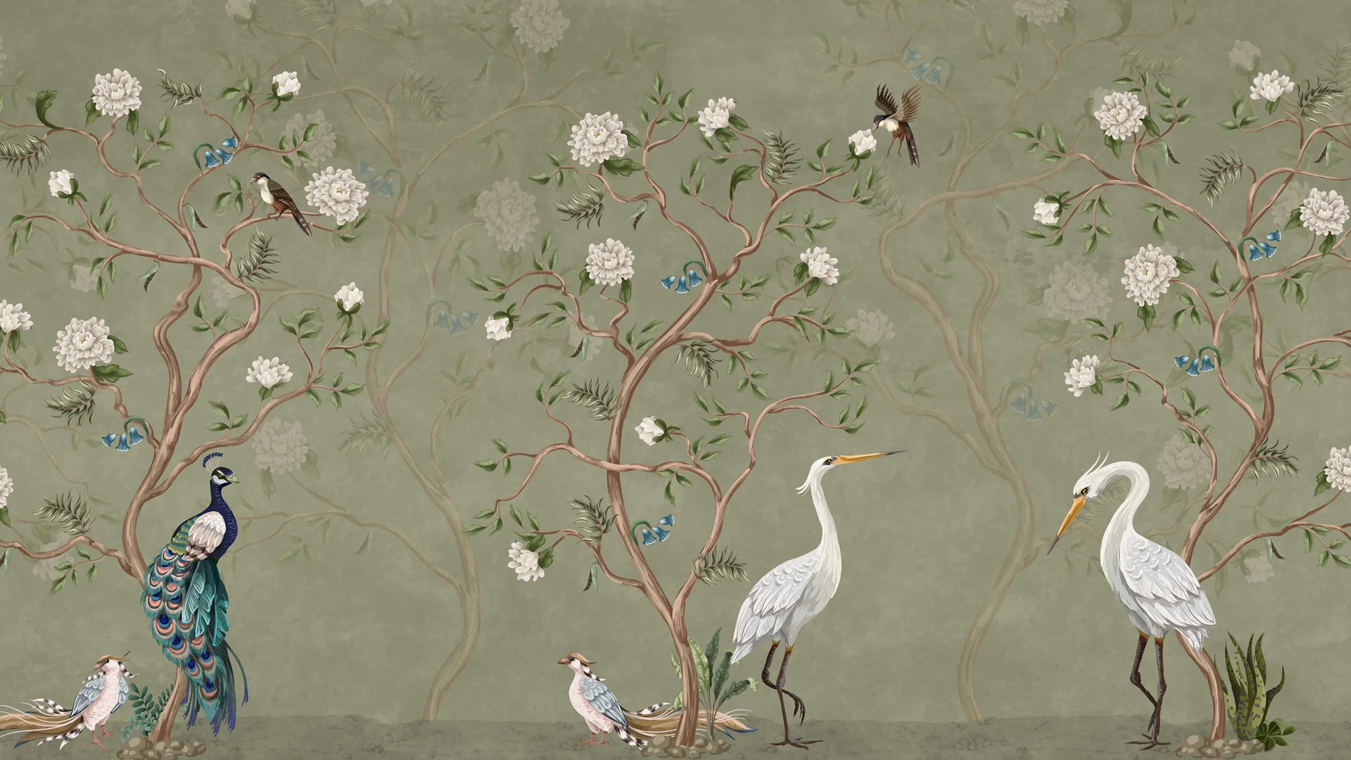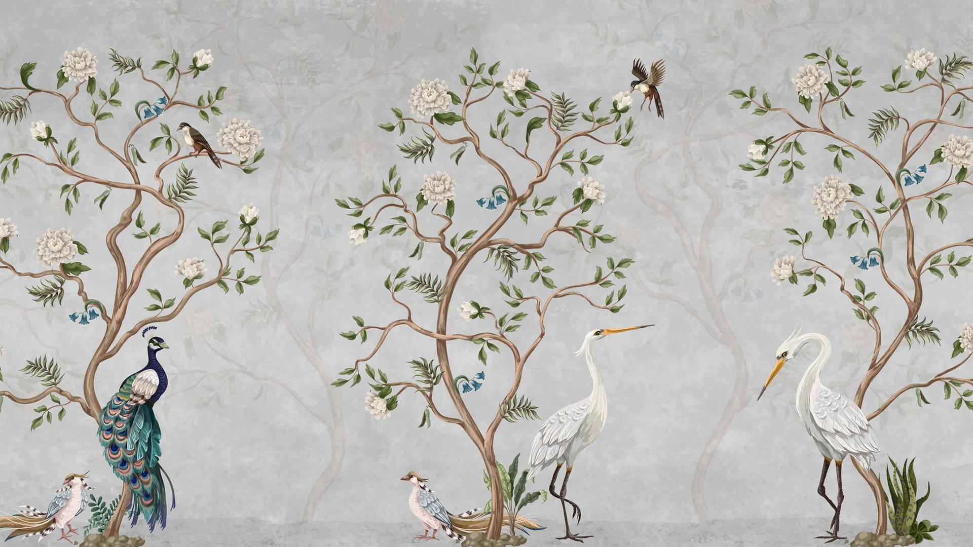 Introducing our chinoiserie bird wallpaper, a stunning wall covering that features graceful peacocks, herons, and other avian species amidst intricately designed Asian-inspired trees. This wallpaper is not merely a decorative element; it is a true work of art that captures the beauty and elegance of these majestic birds in a traditional Chinese aesthetic.