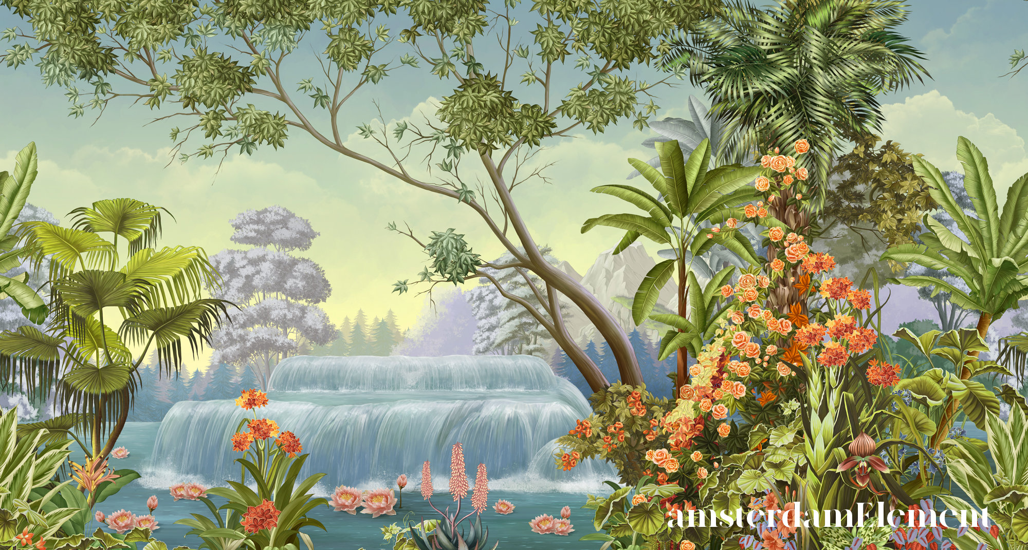 Floral Jungle Wallpaper Mural: Vintage River Print ( or Non-Woven)