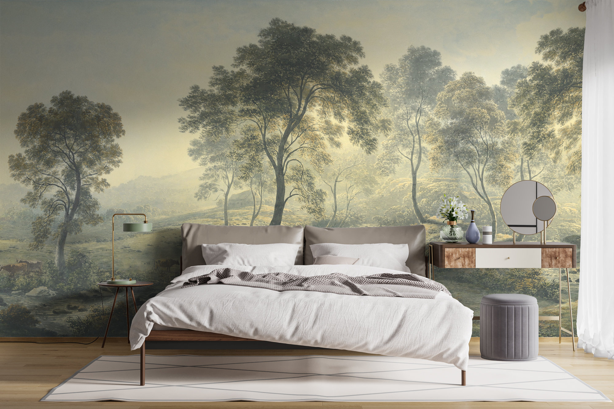 Forest Wallpaper. Removable Wallpaper. Morning Dawn Scenic Landscape. Panoramic in the Valley Wall Mural.
