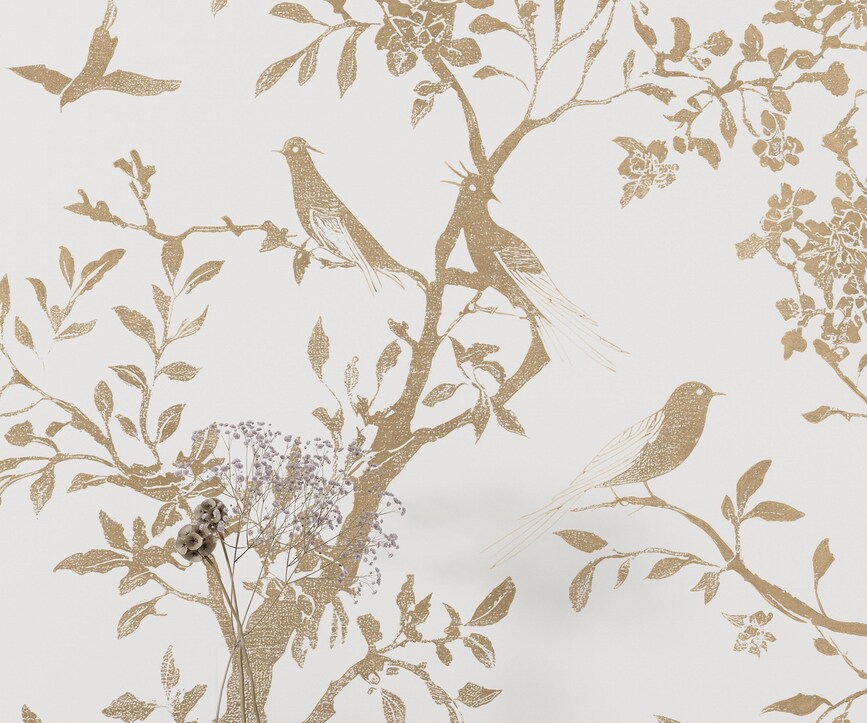 Gold Chinoiserie Birds Wallpaper Bedroom