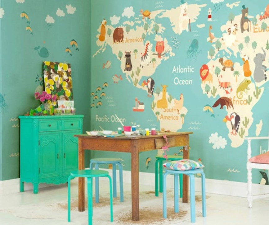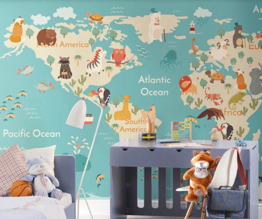 Kids World Map Wallpaper Animal Design Nursery Decor