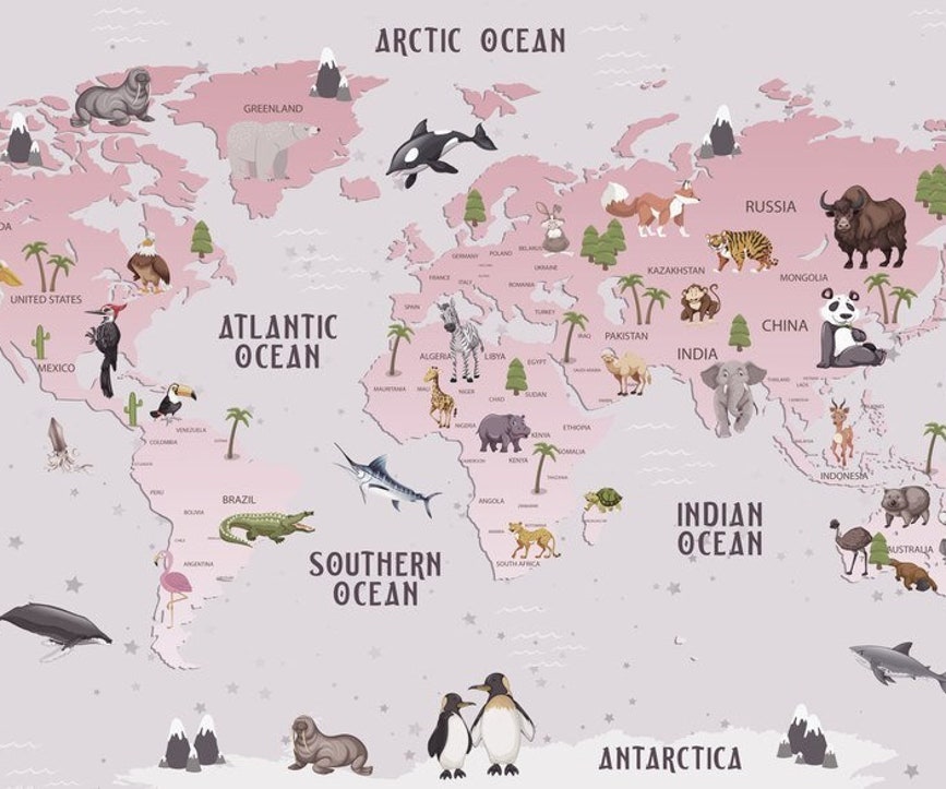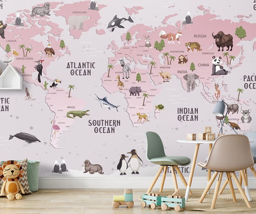 Kids World Map Wallpaper Hot Air Balloons Animals