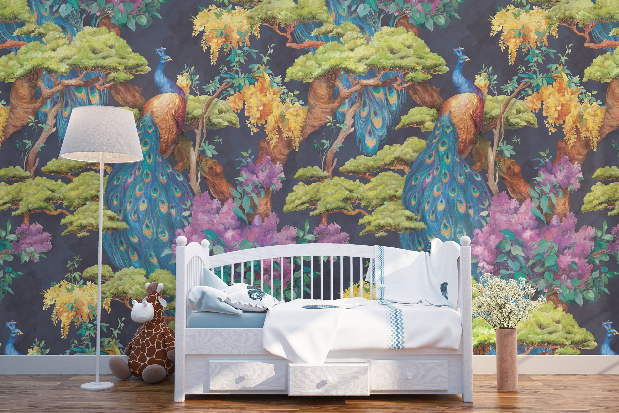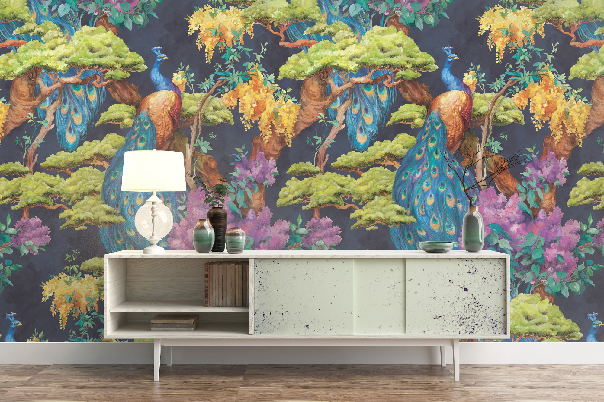 Peacock Wallpaper: Watercolor Floral Chinoiserie Mural