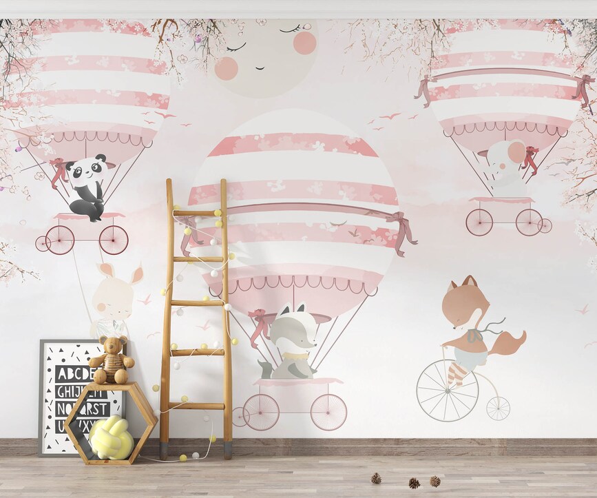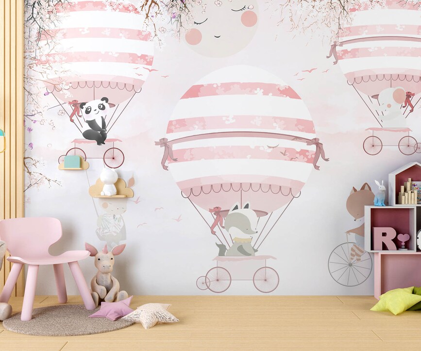 Pink Balloons Kids Wallpaper Mural Animal Hot Air Balloons