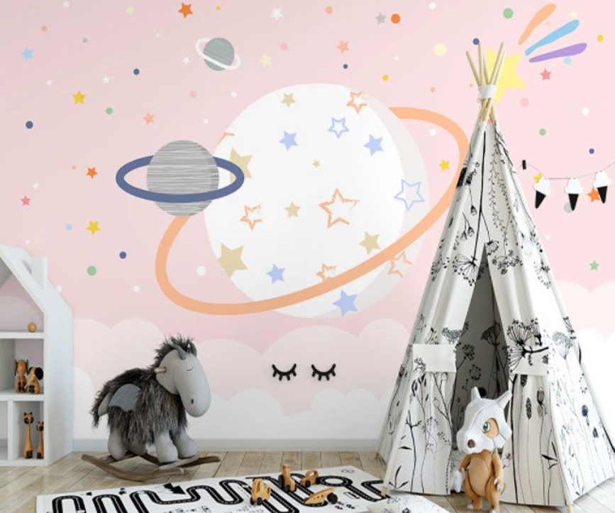 Pink Space Nursery Wallpaper Mural Kids Room Decor