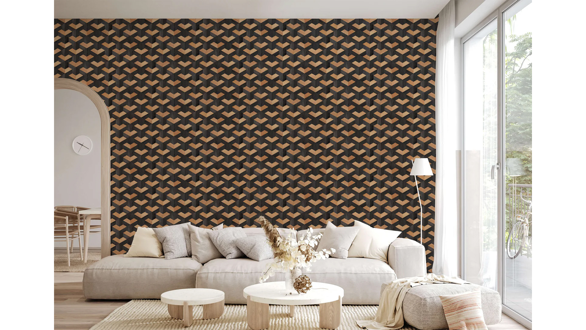 This 3D-effect wood wallpaper ingeniously simulates the appearance of wood paneling through its design of overlapping cubes. With its geometric pattern rich in texture and detail, this wallpaper meets various aesthetic preferences and complements both Scandinavian and industrial-style settings effectively.