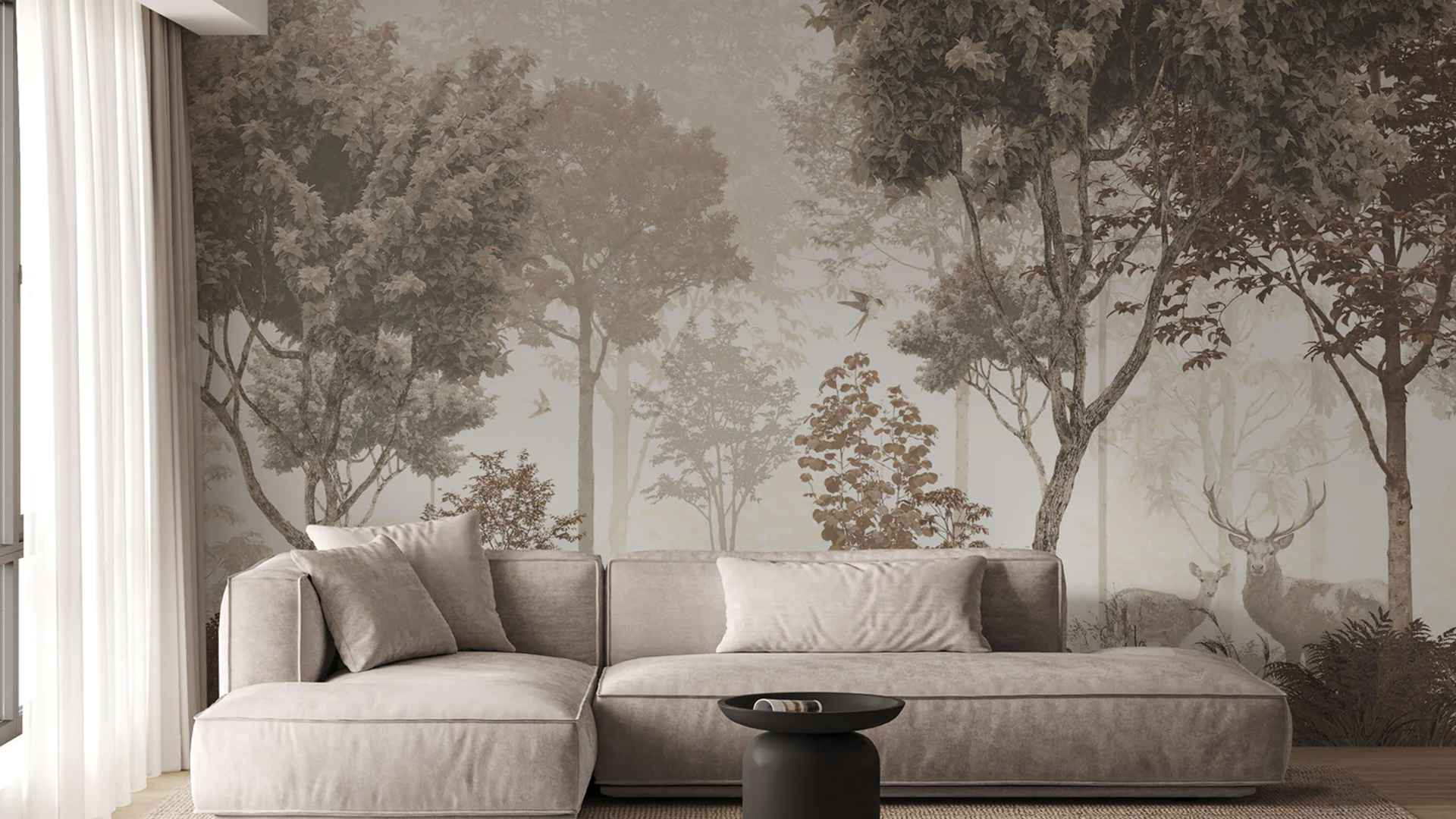 The tonal sepia color palette employed in our ‘Roam’ design effectively evokes the ambiance of a misty woodland. This palette imbues the mural with an air of contemplation that will resonate within the chosen setting. Rich in depth and character, it is a versatile mural that will translate beautifully across various spaces.