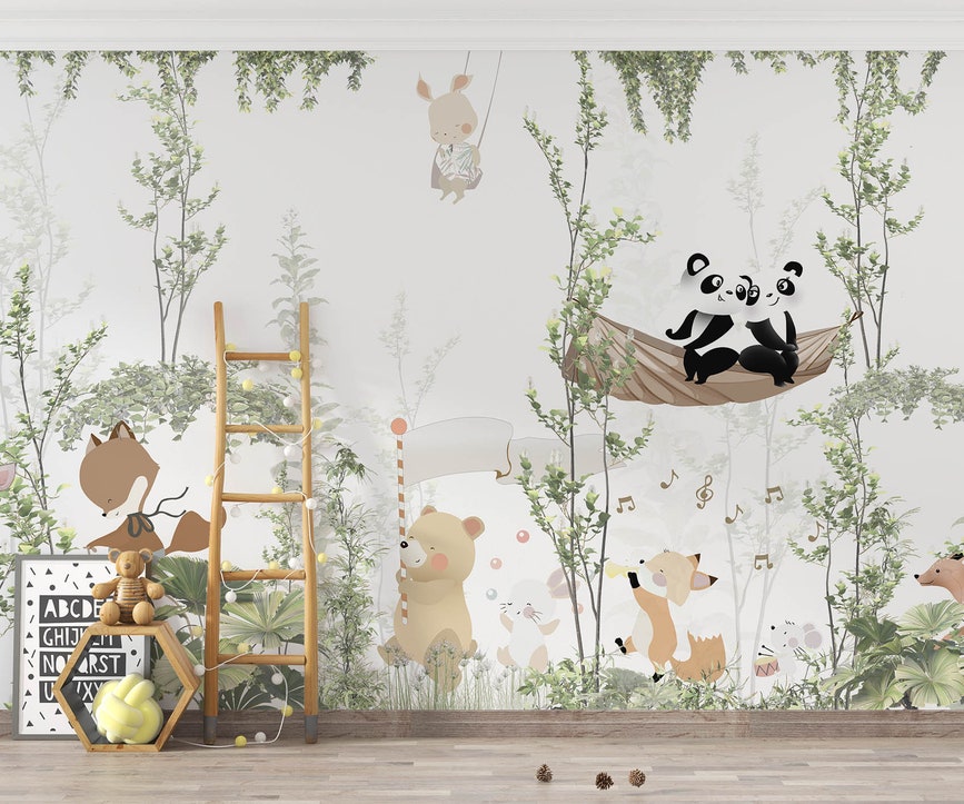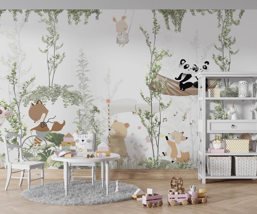 Animals on Airplane Wing Wallpaper Child Room Decor