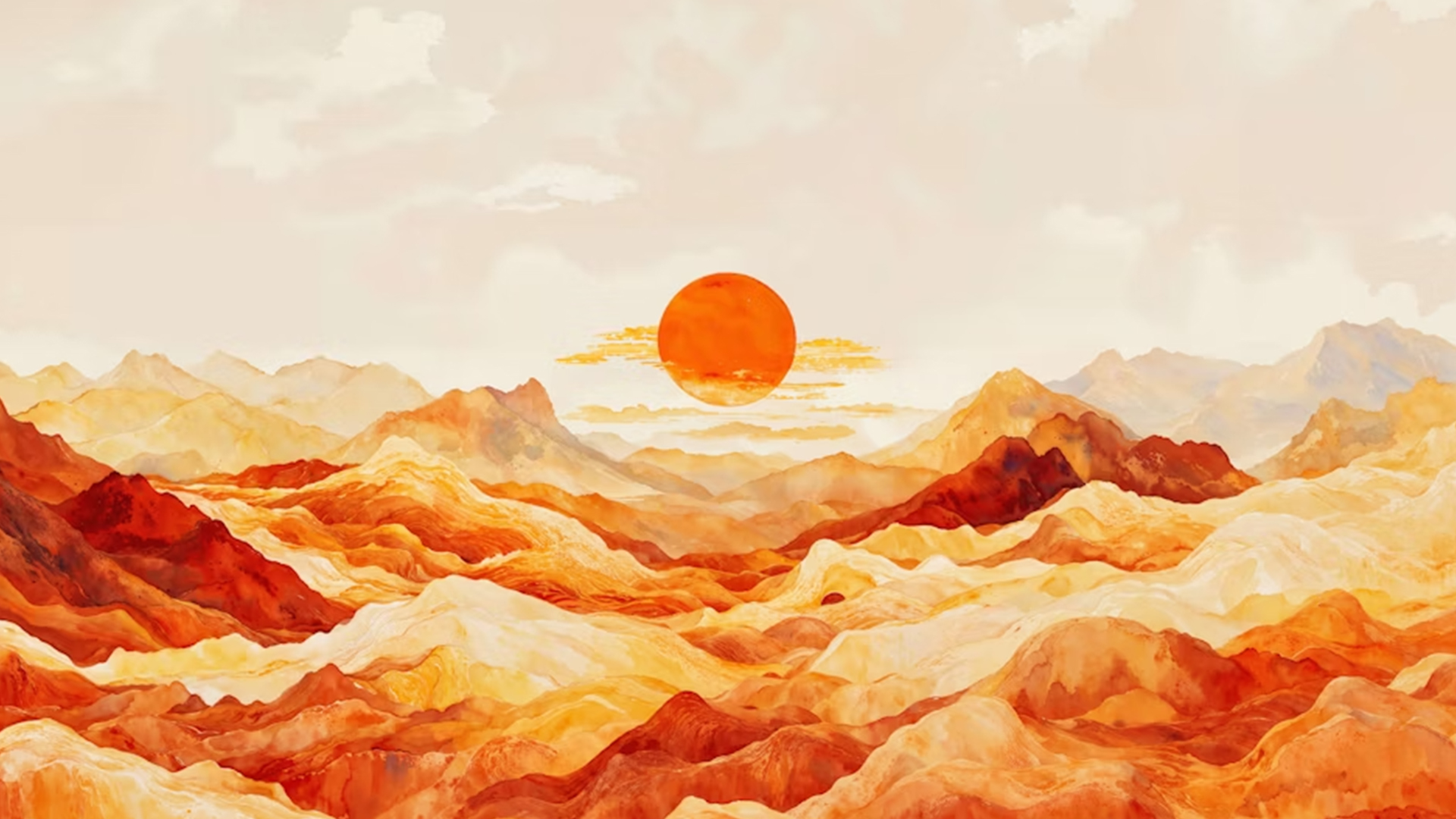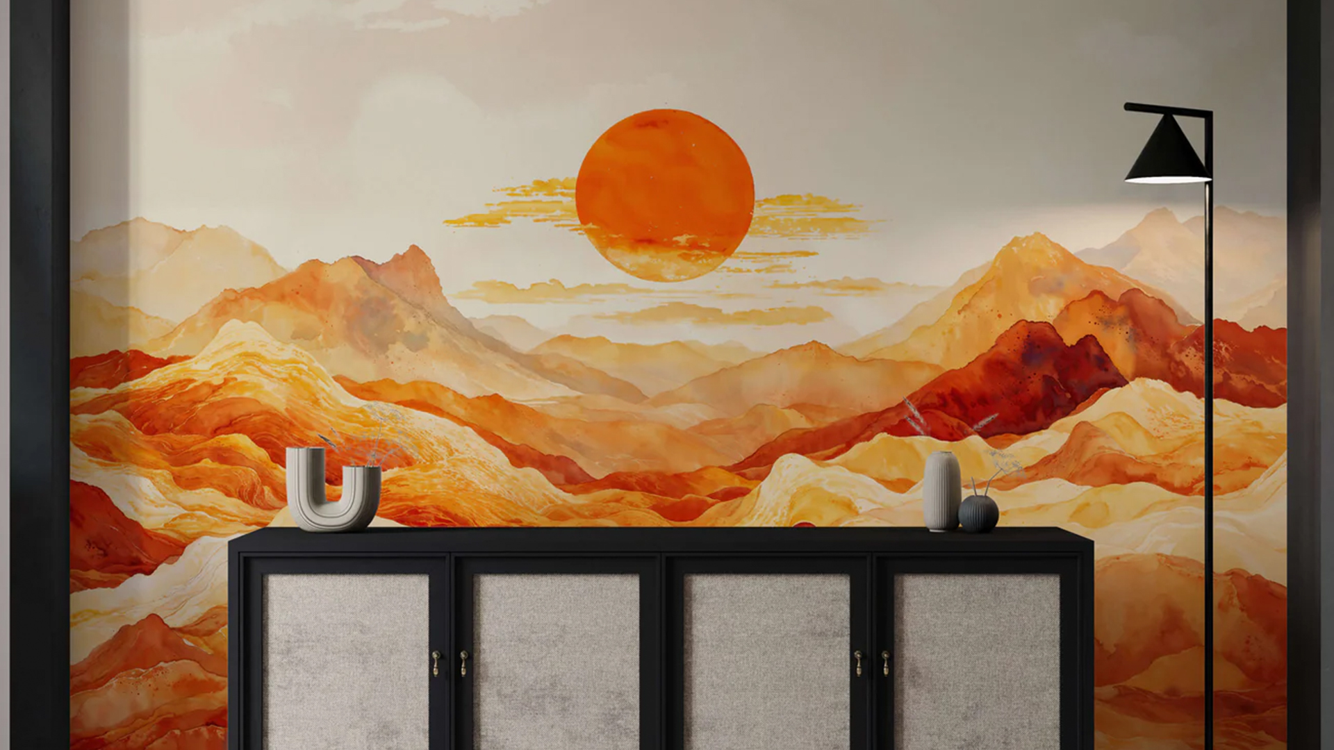 Immerse yourself in the captivating beauty of a fiery sunset with our abstract orange sky wallpaper mural. The rich orange tones set against a twilight sky, complemented by intricately detailed mountains, evoke a profound sense of wonder. This mural is an excellent choice for enthusiasts of textural art and refined aesthetics.