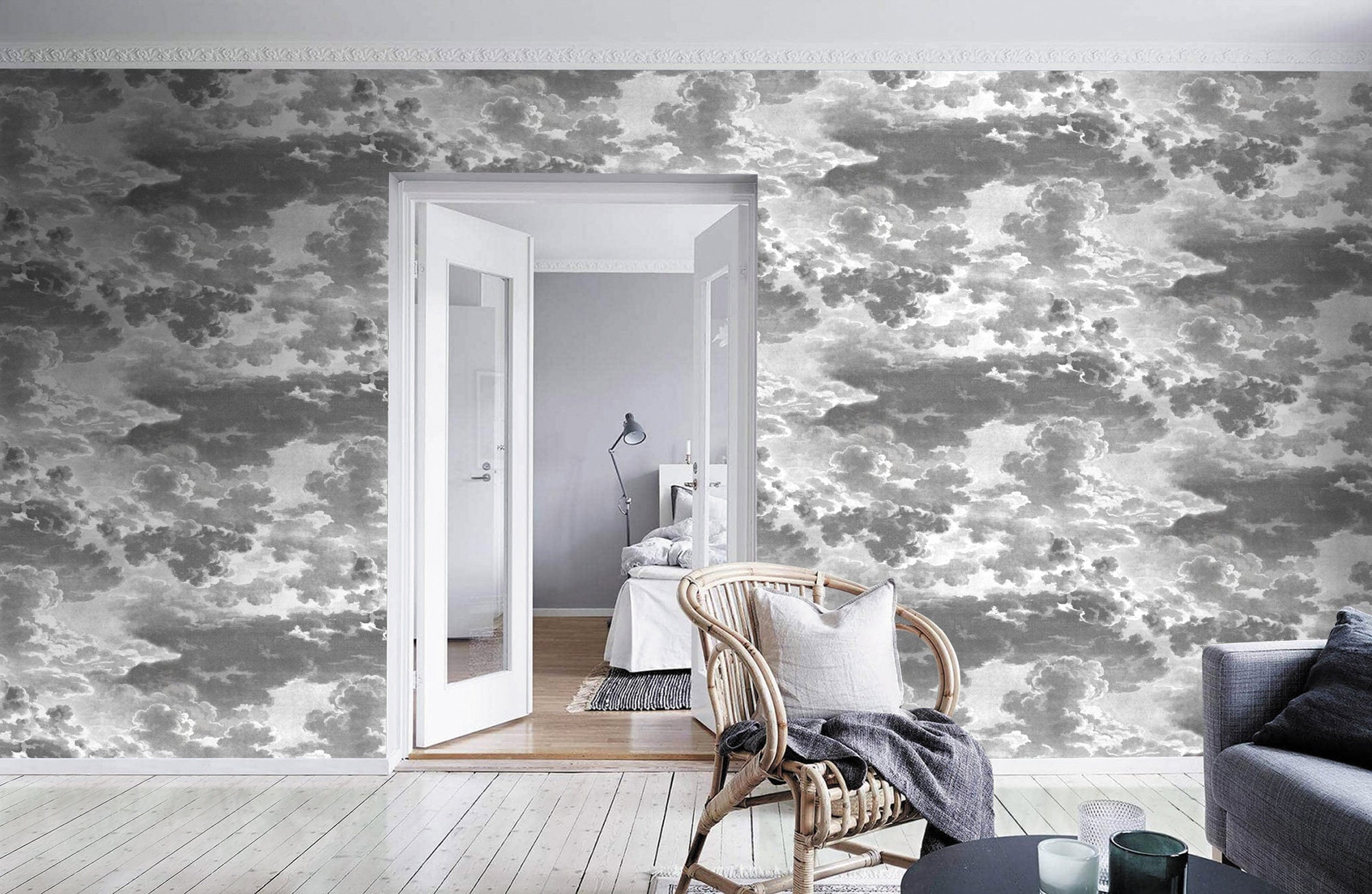 Vintage Clouds Wallpaper Mural: Dark Grisaille Wall Decor ()