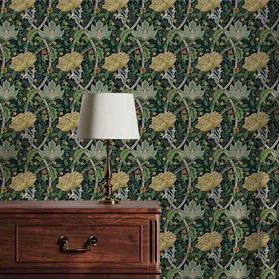 This wallpaper is ideal for those seeking to infuse their interiors with a classic yet luxurious ambiance. Its design pays homage to traditional botanical illustrations, making it especially suitable for spaces where heritage and elegance are paramount, such as dining rooms, lounges, or grand hallways. The rich detailing of the floral vine wallpaper adds depth and texture, making it equally appropriate for a feature wall or an entire room. Its refined balance between nature and design brings sophistication while maintaining a warm, inviting atmosphere, perfect for those who value both style and comfort.