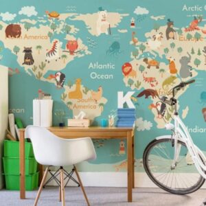 Kids World Map Wallpaper Animal Design Nursery Decor