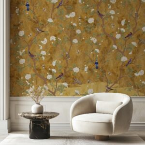 Elegant Vintage Chinoiserie Wallpaper: Gold Birds & Botanical Mural for Home Decor