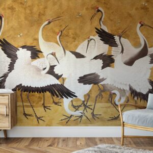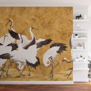 Golden Crane Wallpaper: Japanese Chinoiserie Mural, Removable Wall Decor